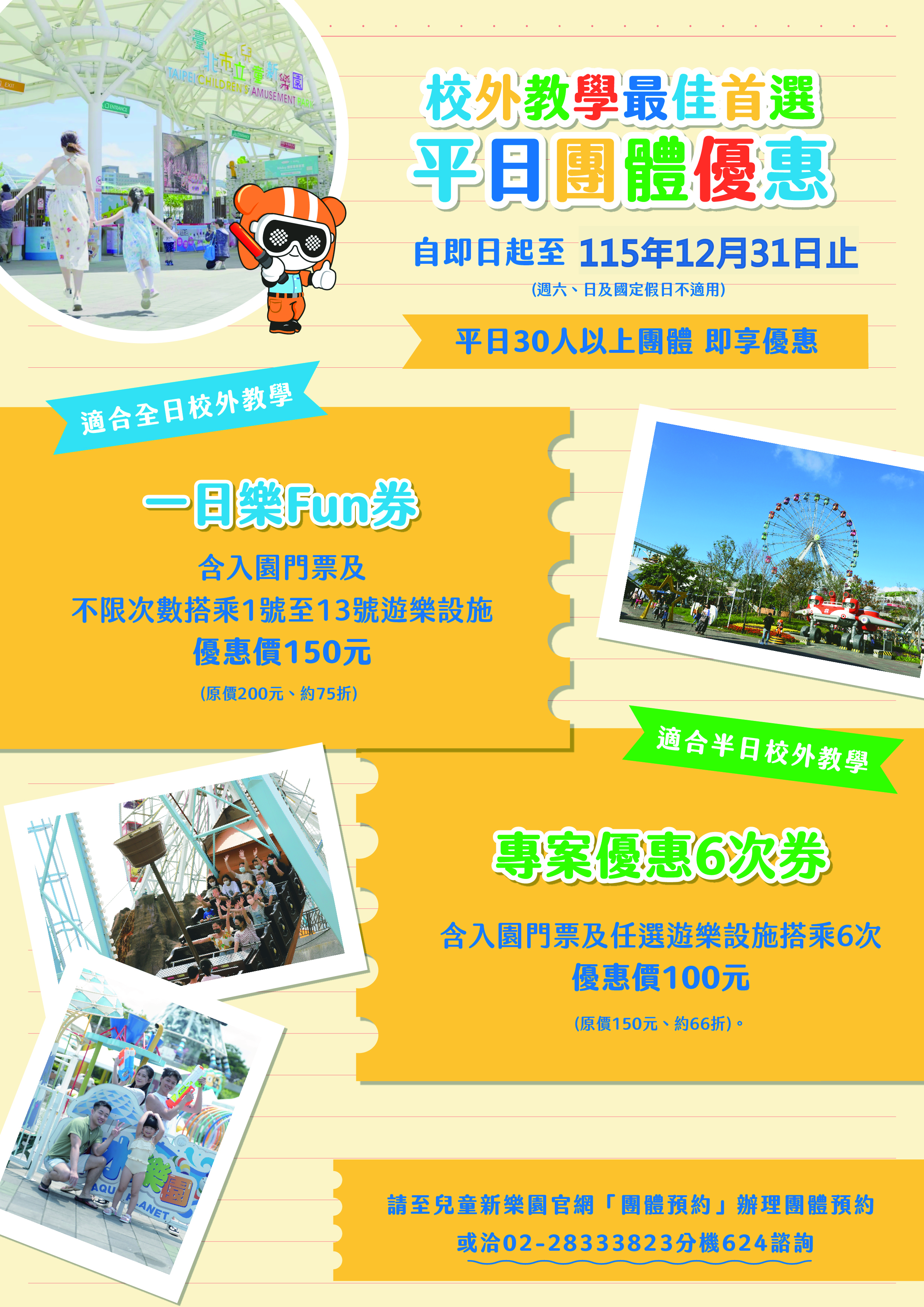 (二) 優惠期間:自即日起至 115年12月31日止,週六、日及國定假日不適用,休園日請參閱兒童新樂園網站公告。