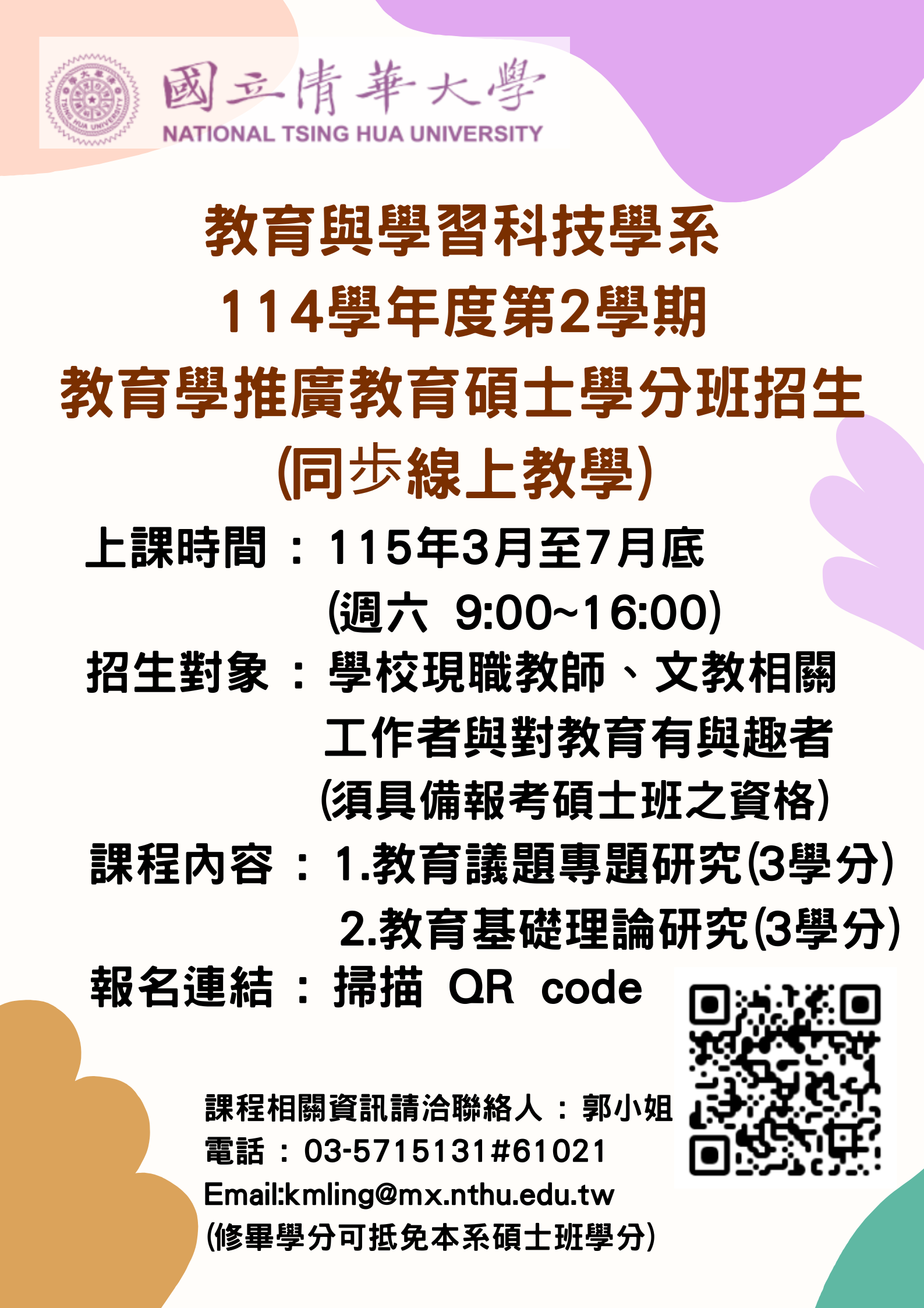 檢送國立清華大學教育與學習科技學系辦理「114學年度第2學期教育學推廣教育碩士學分班(同歩線上教學)招生簡章,詳如說明,請查照。