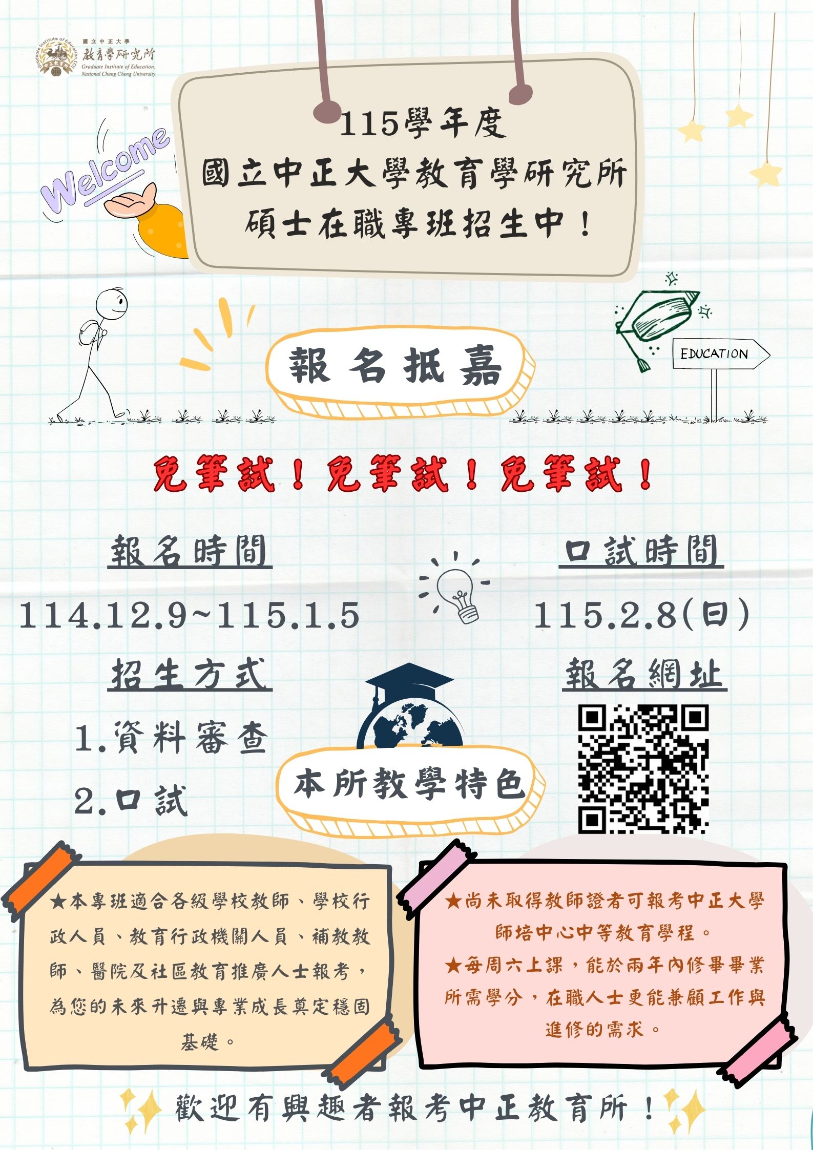 檢送國立中正大學教育學研究所115學年度碩士在職專班招生報名資訊,歡迎報名進修,請查照。