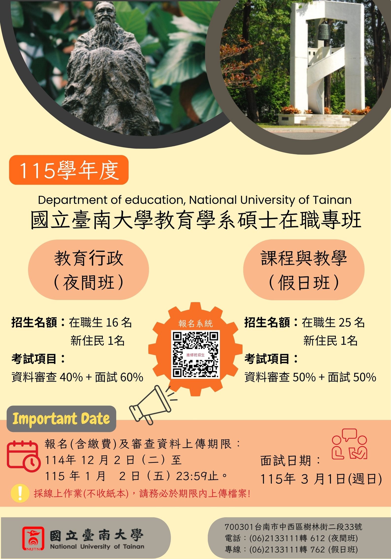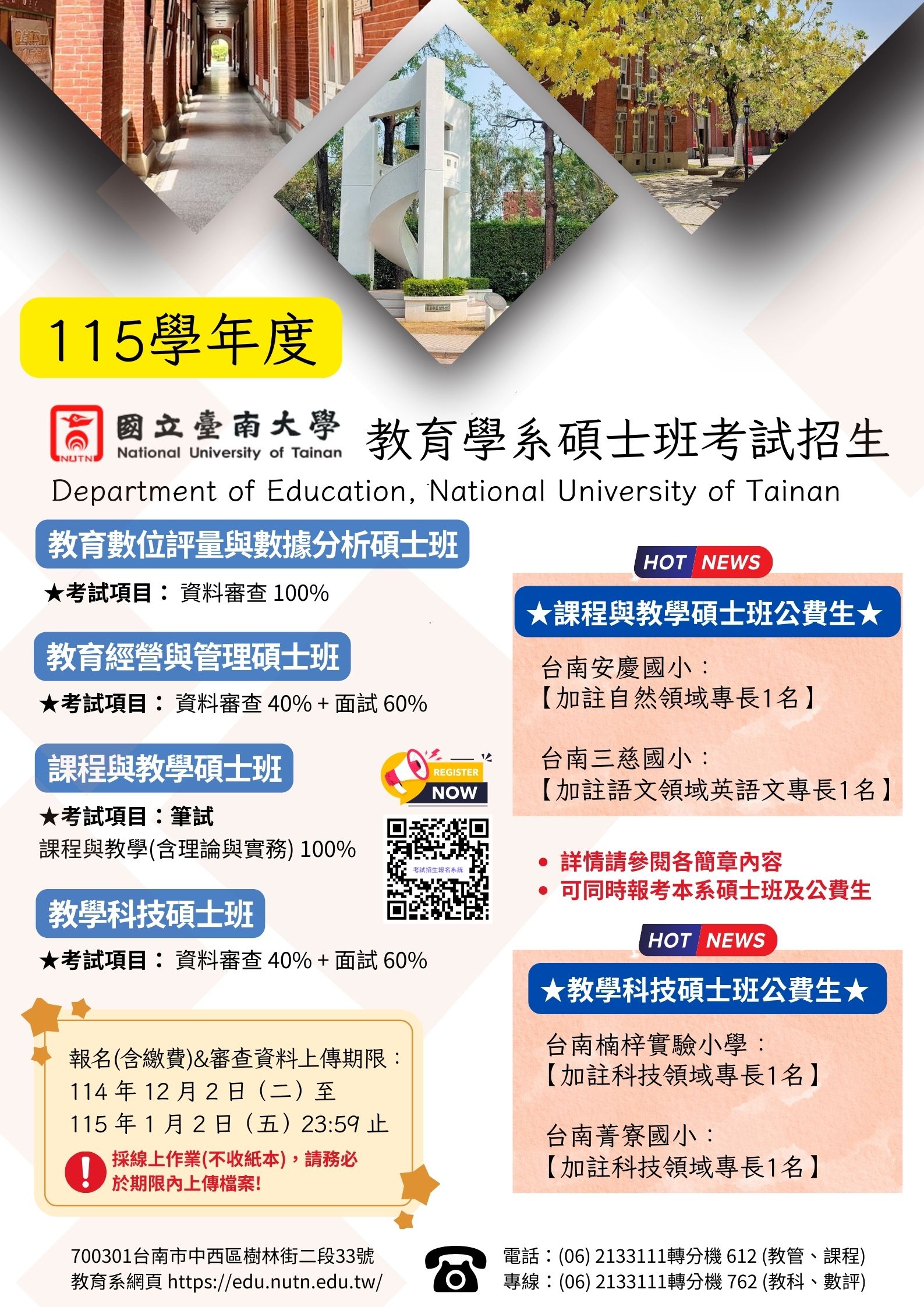轉知國立臺南大學教育學系115學年度碩士班及碩士在職專班入學考試報名資訊 ,請查照。