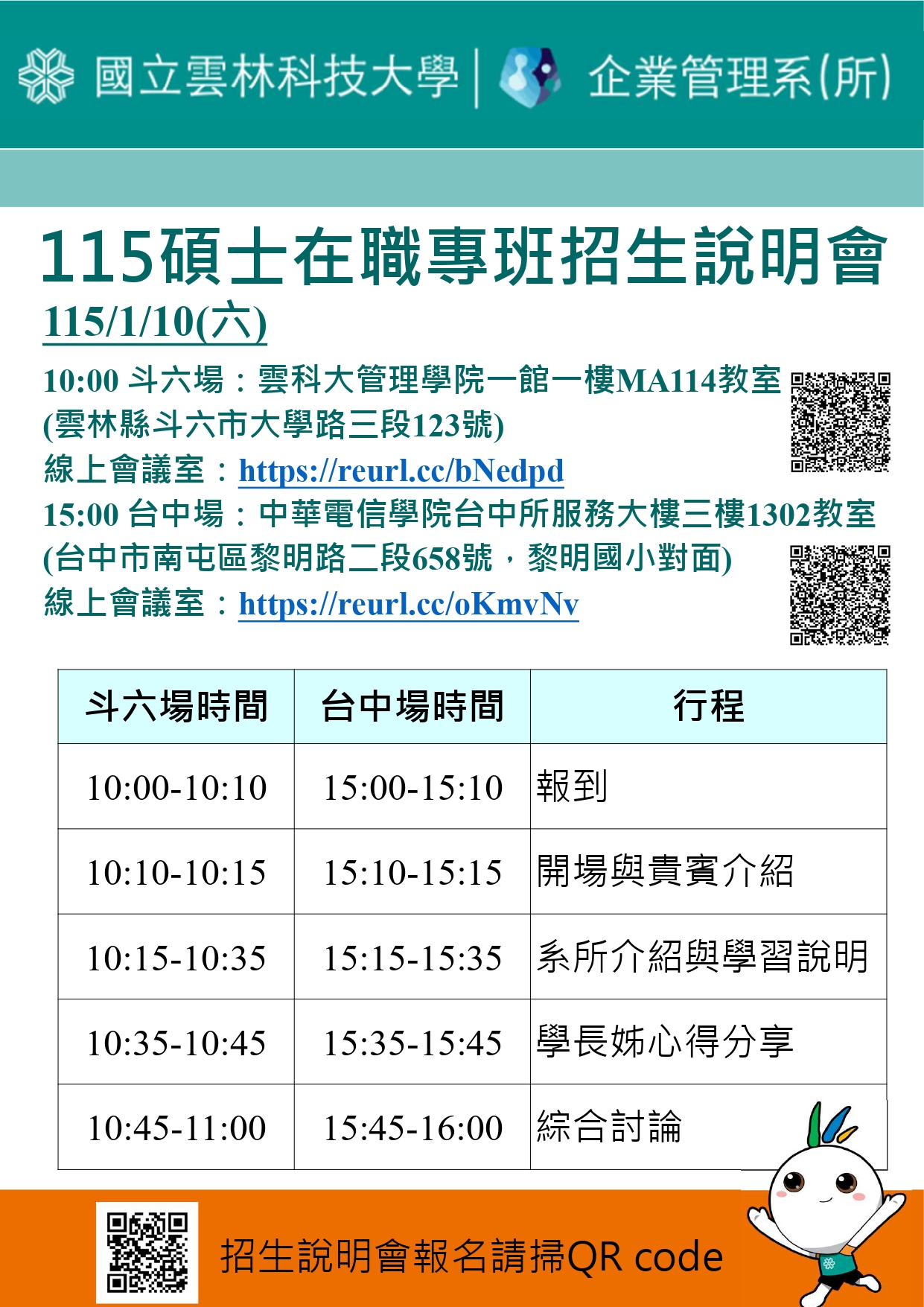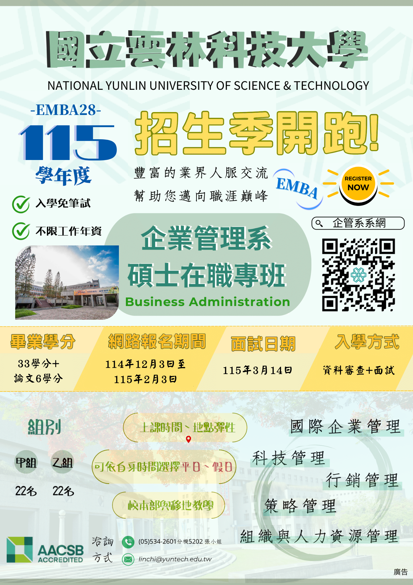 轉知國立雲林科技大學企業管理系115學年度碩士在職專班招生資訊,請查照。