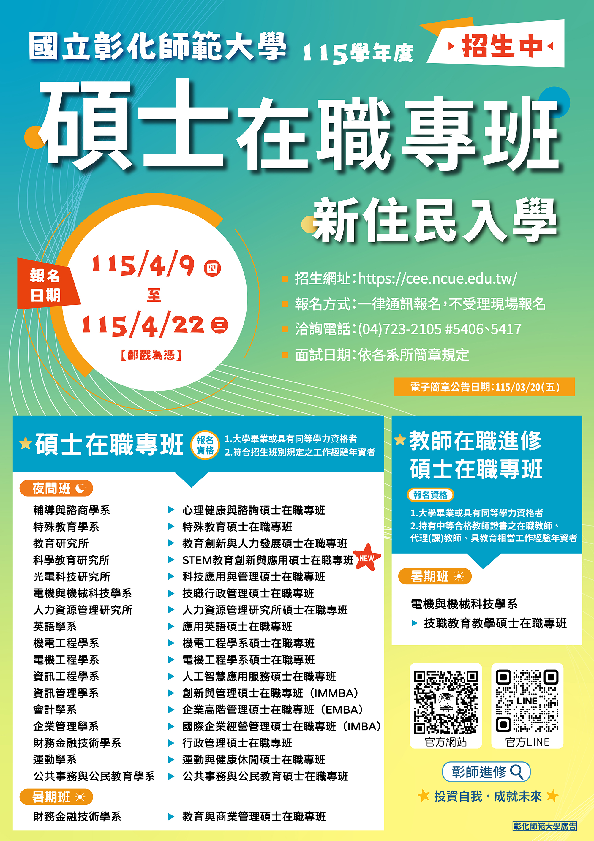 檢送國立彰化師範大學「115學年度碩士在職專班新住民入學」招生資訊及海報,請查照。
