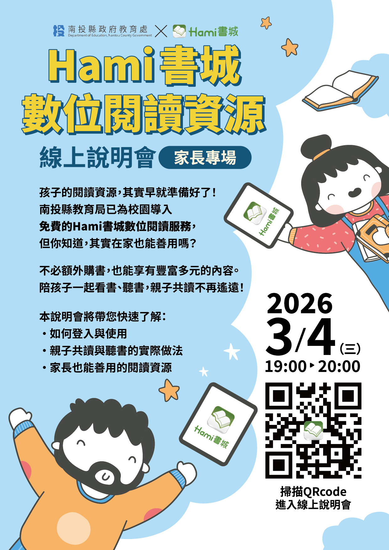 Hami書城辦理「數位閱讀資源」教師實務分享線上場,在職教師進修網課程代碼:5551123,請協助轉知鼓勵教師踴躍參與,請查照。