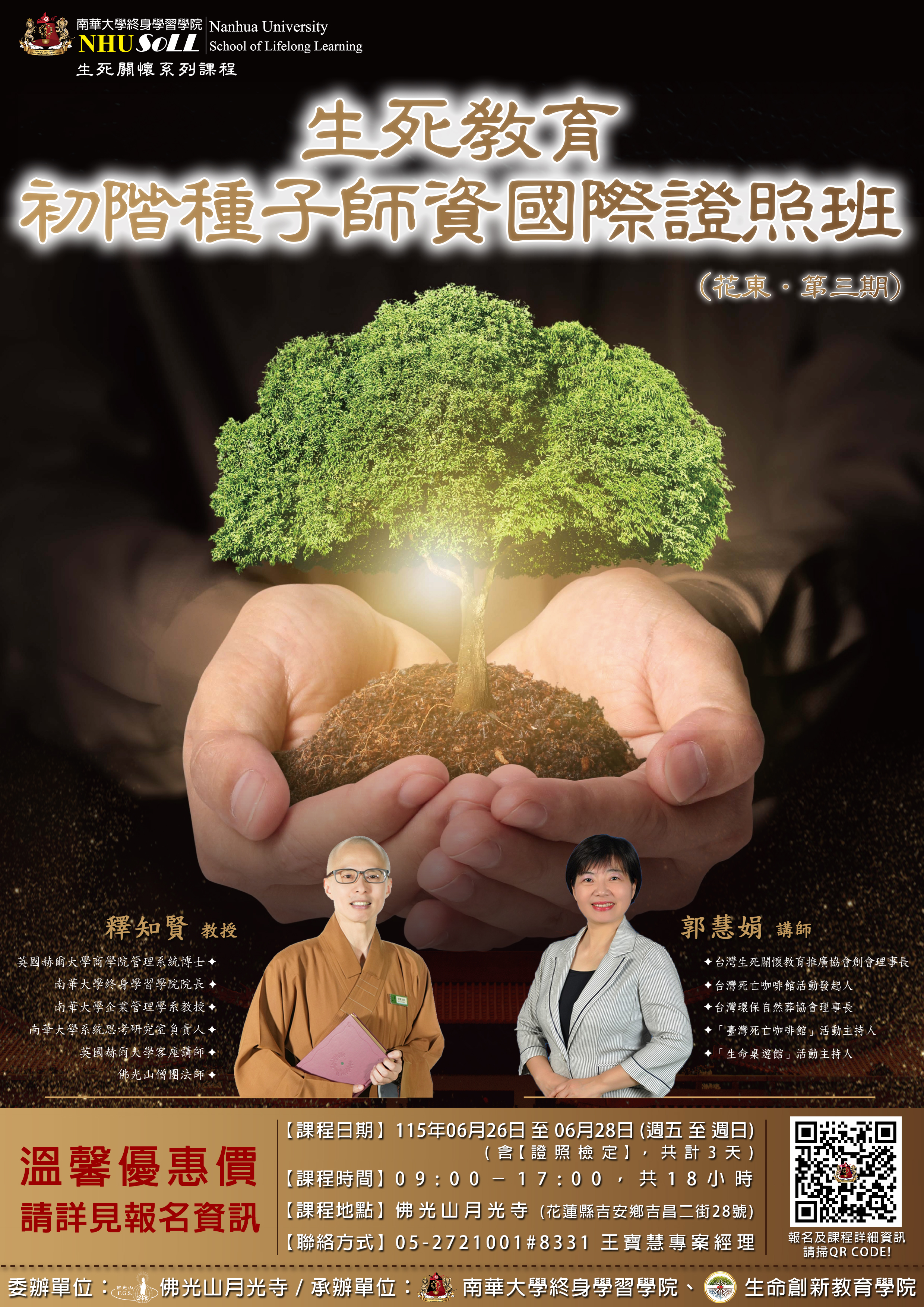 檢送南華大學115年6月份開辦之生死關懷系列【生死教育初階種子師資證照班】(花東.第一期)課程資訊,請查照。