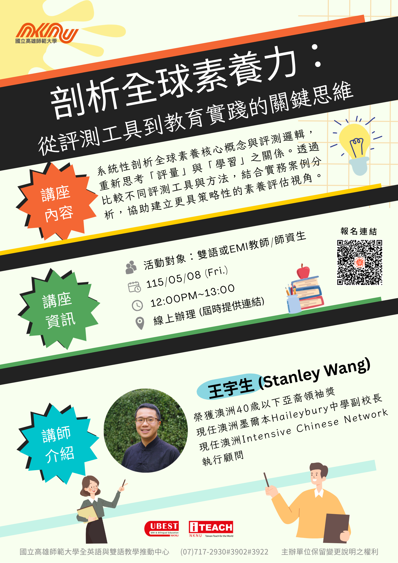 二、為強化教師全球素養與素養導向評量知能,本校「全英語與雙語教學推動中心」辦理旨揭線上講座。