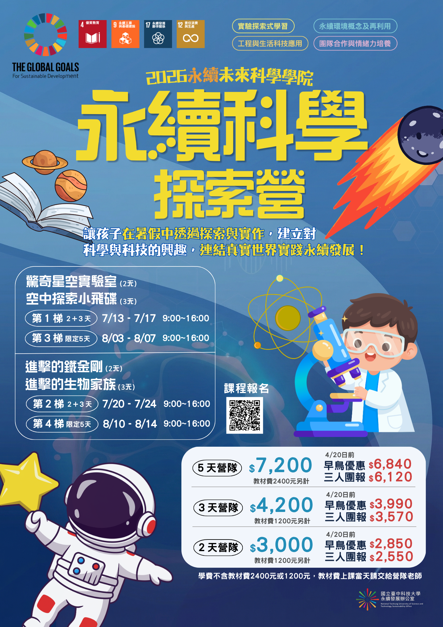 檢送國立臺中科技大學永續發展辦公室辦理「2026永續科學探索營」暑期營隊招生資訊及宣傳海報乙份,請查照。
