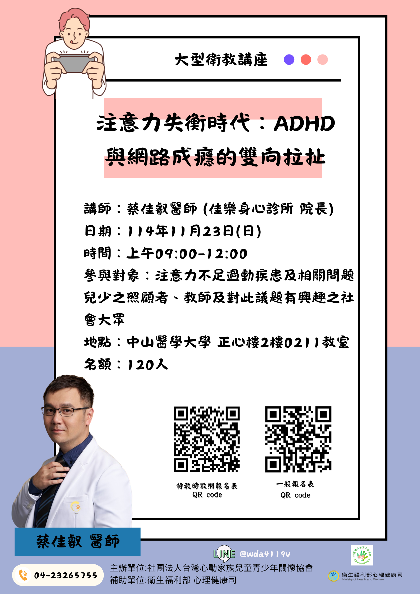 函轉社團法人台灣心動家族兒童青少年關懷協會辦理「114年11月 ADHD 相關主題講座及心理師面對面活動」,請查照。