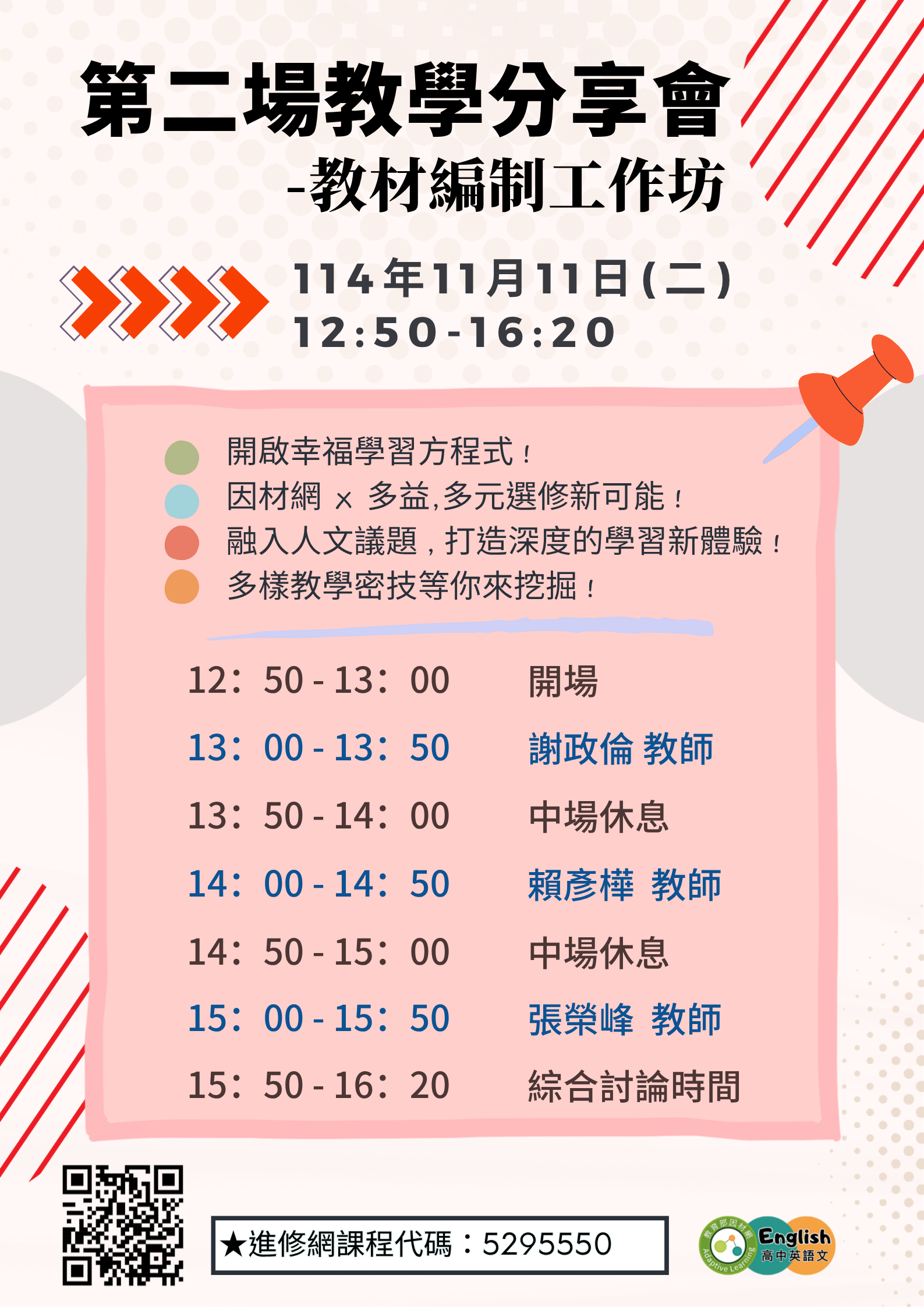七、報名方式:至「全國教師在職進修網」登錄報名,課程代碼 5295550。