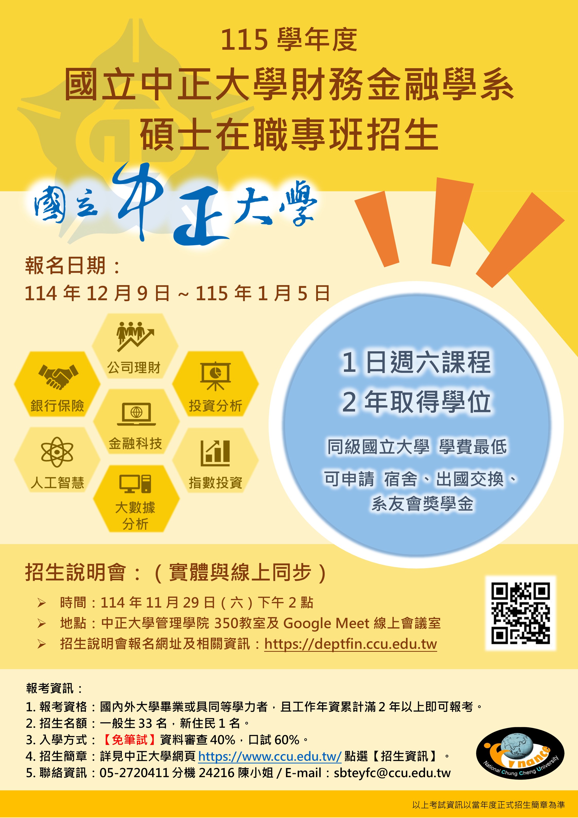 檢送國立中正大學財務金融學系碩士在職專班115學年度招生宣傳海報,請有意進修同仁報名,請查照。
